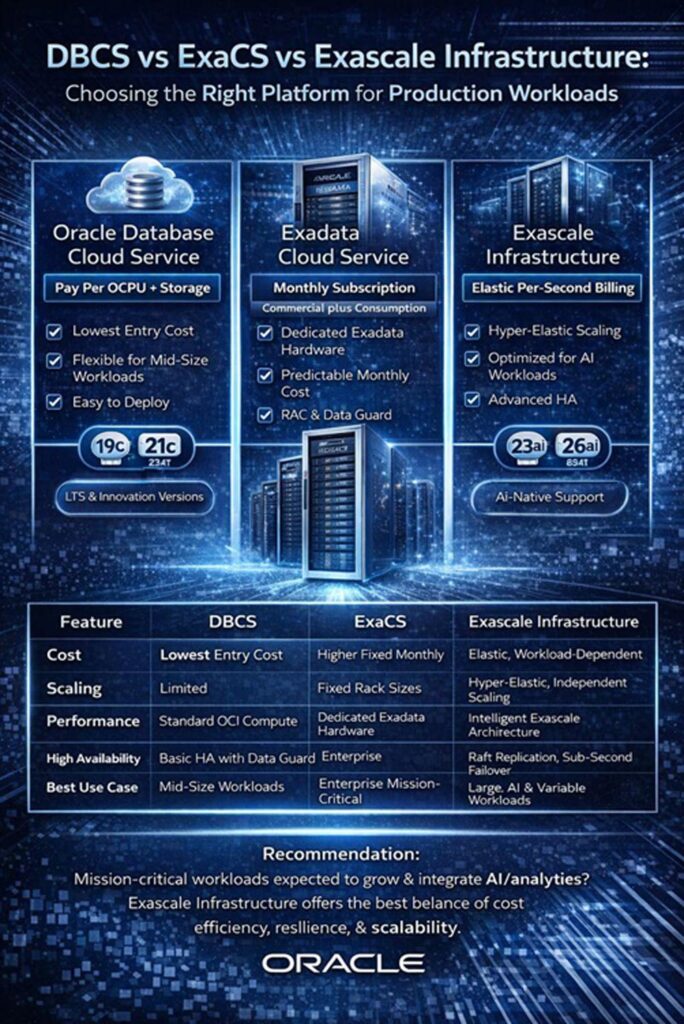 Exascale Infrastructure (ExaDB-XS) | Oracle Database 23ai, 26ai | Designed for AI-native workloads; supports the newest long-term support releases with hyper-elastic scaling. |